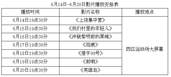 为庆祝中国共产党建党90周年,进一步加强对师生员工进行党史学习教育、革命传统教育、理念信念教育,激发师生员工坚定在中国共产党的领导下,建设中国特色社会主义的理想信念,根据学校《关于开展纪念中国共产党建党90周年系列活动的通知》(党发[2011] 28号)文件精神,从5月26日起开展百部红色影视展播活动。活动期间,每天19:30分在学校西区运动场大屏幕播放红色影片,我们将在每周一公布一周影片播放安排表,欢迎大家届时收看。