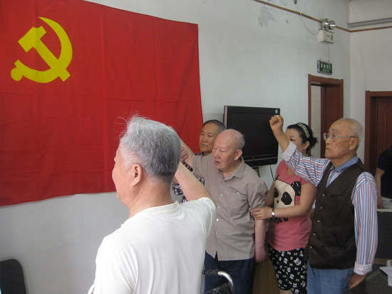 支部全体党员齐唱《国际歌》后,由支部书记汪孟春同志领誓,新党员黄秋农同志、刘波同志在党旗下庄严宣誓。黄秋农同志年事已高,站立和行走都非常困难,需要人搀扶,但他仍然坚持面对党旗,站立宣誓,更加体现了他对党的无限忠诚。