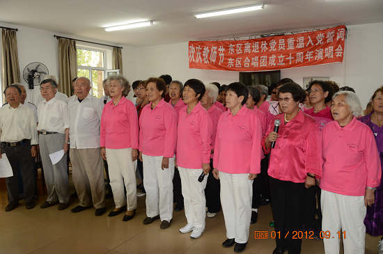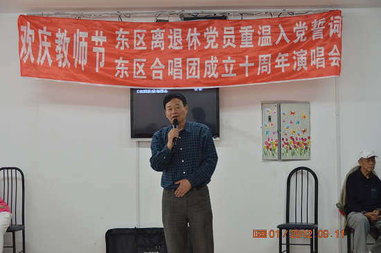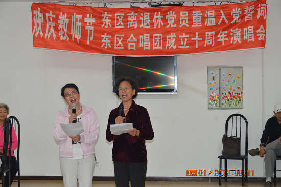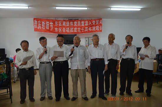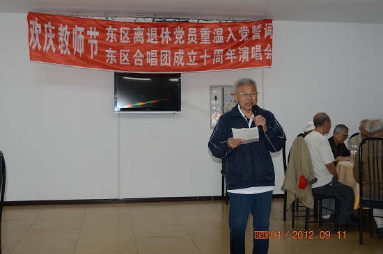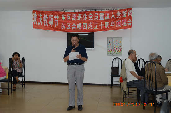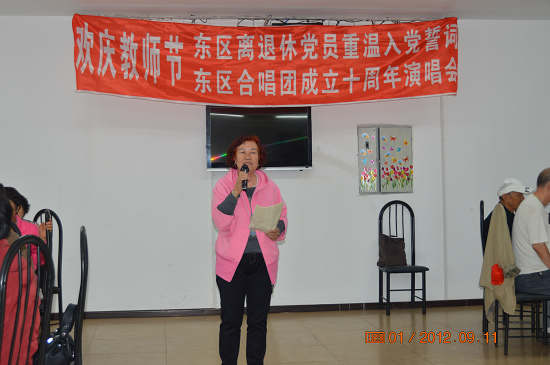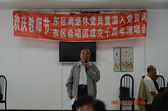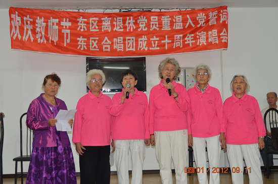 今年恰逢东区合唱团成立十周年,东区离休党支部、东区退休党支部邀请合唱团全体成员一起共庆教师节、国庆节和中秋佳节。本次活动由东区退休党支部书记单荣海同志主诗,离退休党委书记杨石滨致辞,在退休党支部委员苏秀成同志与老党员重温入党誓词之后,合唱团长万玉霞讲述了合唱团十年来的发展历程,党员和群众同登舞台,演出精彩的文艺节目,表达对党、对祖国、对社会主义的热爱之情。离退休老党员大多七、八十岁,平时行动不便很少出门,但对这次活动非常重视,都积极地参加。原电工学院的老院长张德毅和老书记唐传林等同志兴致勃勃地参加了活动。