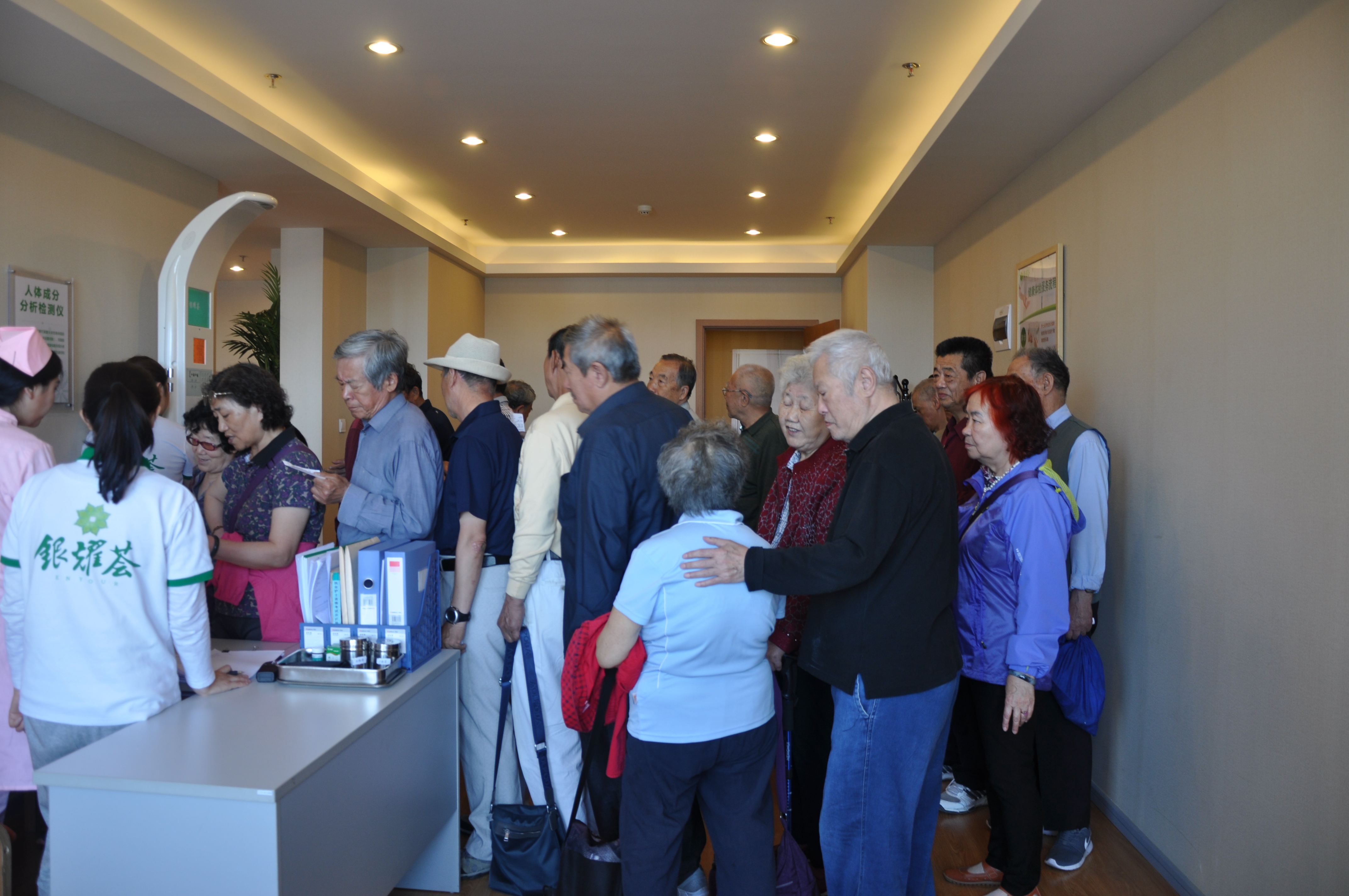 离退休骨干们参观了体验室、康复室、手工教室、棋盘室、乒乓球室、书画室、多功能厅、双人间及单人间,公共区域及室内空间的无障碍设施。银耀荟医护人员为参观人员进行了人体成分分析、红外脉冲康复理疗、骨质疏松治疗,体检完了大家极有兴趣地在活动室里打麻将,打台球,在书画室谈字论画,体验这里的活动项目,感叹这里的环境好,设施完善,服务到位,太适合老年人养老了,有的老同志很详细的询问价格、服务、医疗等情况,最后大家在餐厅品尝了营养粥、营养汤。