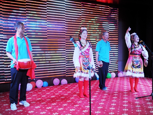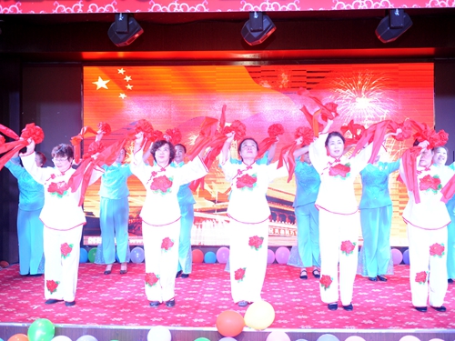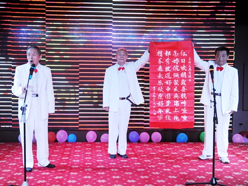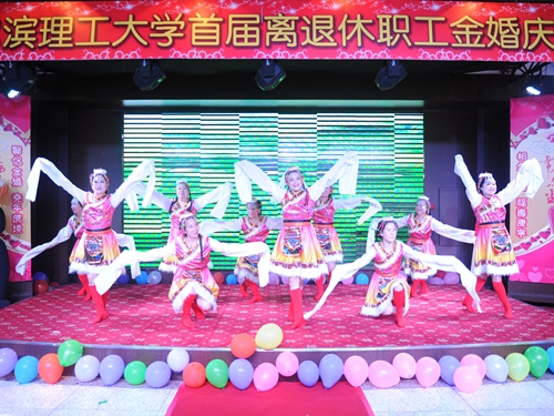 庆典活动安排了文艺演出环节,老同志们自编自演了精彩的文艺节目,开场红绸舞《祖国你好》表达了老人们对祖国母亲的深情厚谊,老同志还相继以模特表演、挥毫泼墨写书法、三句半、大合唱等形式展示了他们的多才多艺,离退休工作处全体工作人员更是以他们表演的健身舞《小苹果》表达了全体工作人员对老同志的一片深情。庆典现场的LED屏幕播放了由离退休工作处精心制作的136对结婚50年以上老夫妇的电子视频相册,参加庆典的金婚夫妇逐一在红地毯拱型门下驻足留影,现场充满欢乐喜庆、幸福温情的气氛。老同志们纷纷表示,盛大、热烈的金婚庆典令他们终身难忘。庆典结束后,老夫妇们乐不思蜀,大家纷纷在LED大屏幕前合影留念,并与参会校领导握手致谢,感谢学校对老同志的关怀、对离退休工作的支持。庆典活动在吉祥、喜庆的气氛中徐徐落下帷幕。
