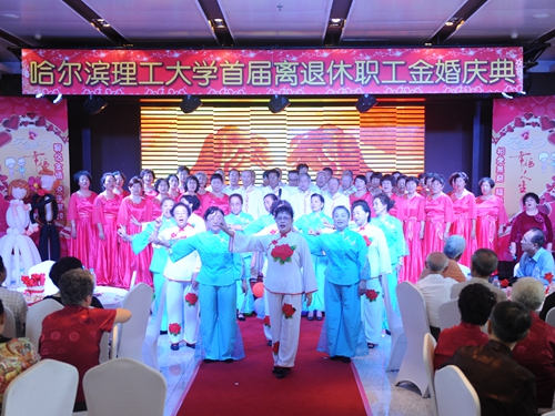 校党委书记赵国刚代表学校向金婚夫妇表示祝贺,感谢他们多年来对学校发展做出的贡献,祝他们健康长寿、携手百年。省委老干部局副局长唐丽在讲话中对哈理工举办金婚庆典活动给予了充分肯定,表示此次活动是敬老之举、文明之举、和谐之举、发展之举、创新之举。
