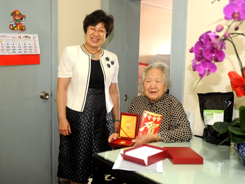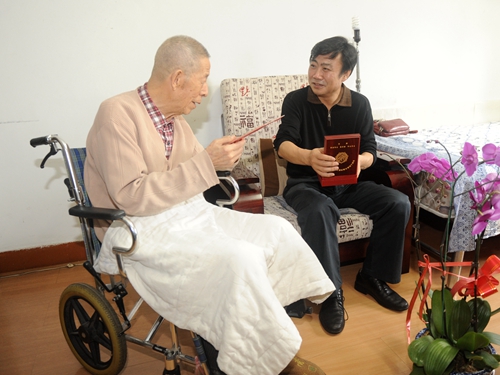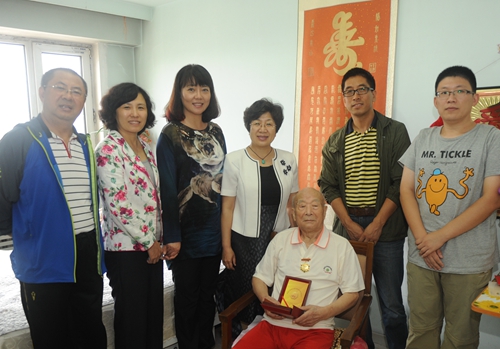 听说学校领导要来家里,老同志们都非常兴奋与激动,让子女们帮助做了充分的准备,穿上自己最喜欢的衣着,当校领导到家后更是激动不已,紧紧拉着领导的手不肯放开。校党委书记赵国刚代表学校传达了“关于转发《中共中央组织部 财政部关于为抗战时期及以前参加革命工作的离休干部发放一次性慰问金的通知》”并送上了慰问金5000元,还亲自向3位老同志颁发了由中共中央国务院、中央军委颁发的“中国人民抗日战争胜利70周年纪念章”并将纪念章佩戴在老同志胸前。赵国刚书记、陆岩副书记关心的询问老同志生活、身体等方面的情况,高度赞扬了他们为民族解放事业做出的重要贡献,高度评价了他们在新中国成立后,继续艰苦奋斗,积极投身社会主义建设事业,为祖国的繁荣富强、教育科技事业的振兴,特别是哈尔滨理工大学的发展做出的重要业绩。老同志们回顾了抗战时期一些难以忘怀的经历,他们感谢党和政府及校领导的关心,并对学校的改革与发展寄予殷切的期望。学校领导希望3位老同志继续为哈尔滨理工大学的建设与发展献计献策,并衷心祝愿他们健康长寿、阖家幸福。