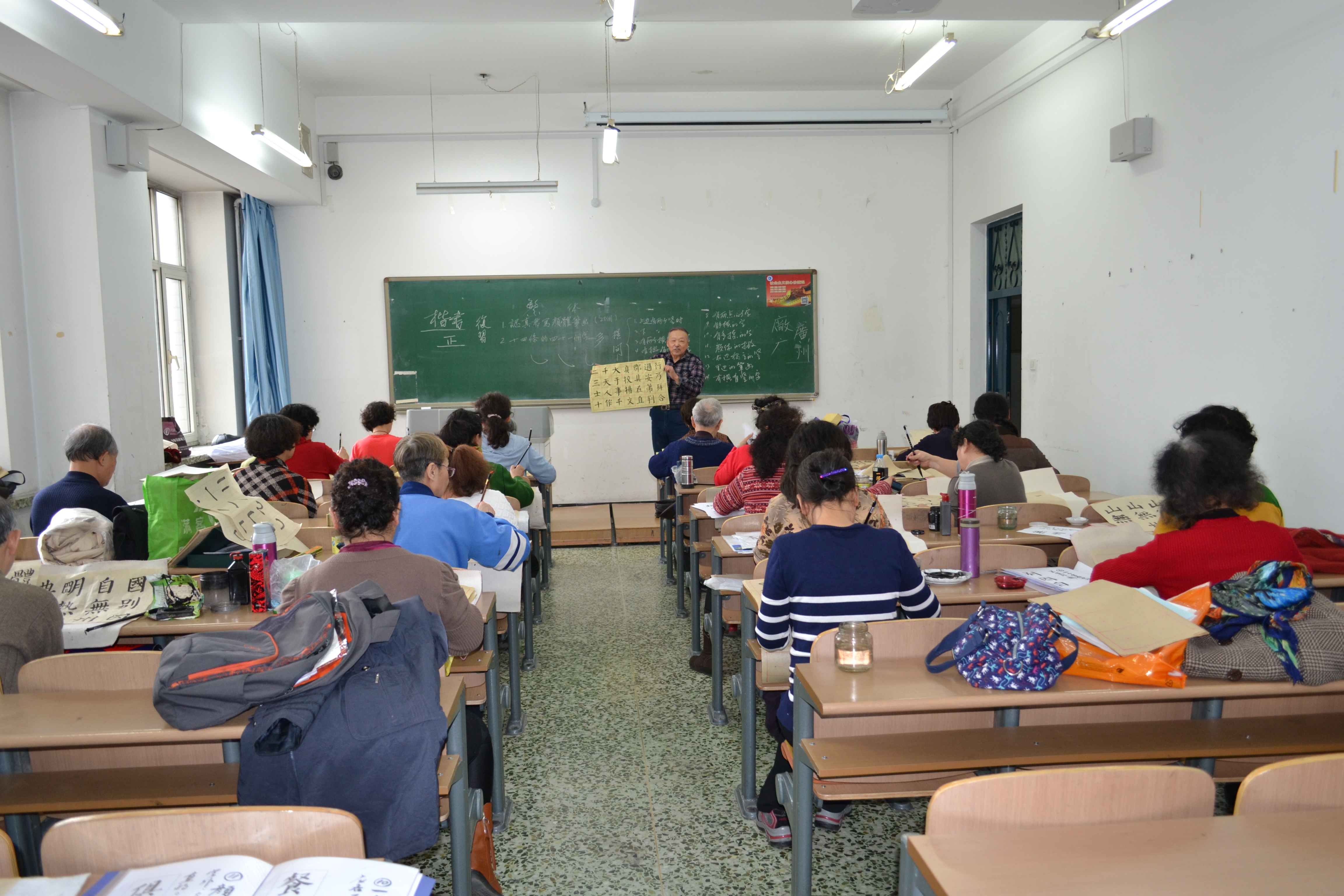 2016年3月7日,哈尔滨理工大学离退休工作处老年学院兴趣班陆续开课,学员们都以饱满的热情开始新学期的学习,书法、绘画班的学员们都带着一沓沓的寒假作业交给老师,空闲间二位老师耐心细致地批改作业,一幅群马奔腾作品在绘画老师的批改下,再加上书法老师的题字,变成一幅很完美的作品,书法老师上课前很潇洒地在黑板上书写一行很醒目的大字“给同学们拜个晚年”,同学们马上齐声问候老师,课堂上呈现出师生和谐的热烈气氛;剪纸班老师用熟练的手法几下就剪出一只形象逼真的大公鸡,激发了学员们对民间手工艺术的热爱;西区声乐班在班长全体起立一声号令下,学员齐声说:老师好!老师面带微笑回应,同学们好!从每个学员的表情中都流露出重新坐在教室学习的一种喜悦心情,规范性授课方式激发了学员们的学习热情,表现出老有所学、老有所乐的精神风貌,丰富了晚年生活。