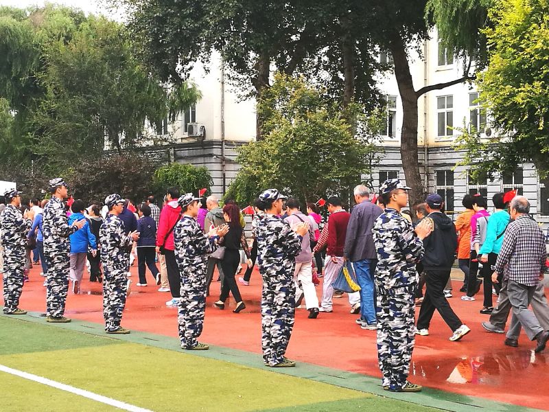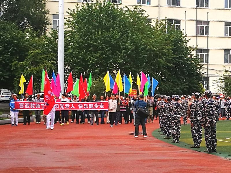 9月9日上午十点,西区离退休老同志在休闲广场“喜迎教师节 做阳光老人 快乐健步走”,恰逢新生在操场军训,于是,呈现出激情互动的感人场景。