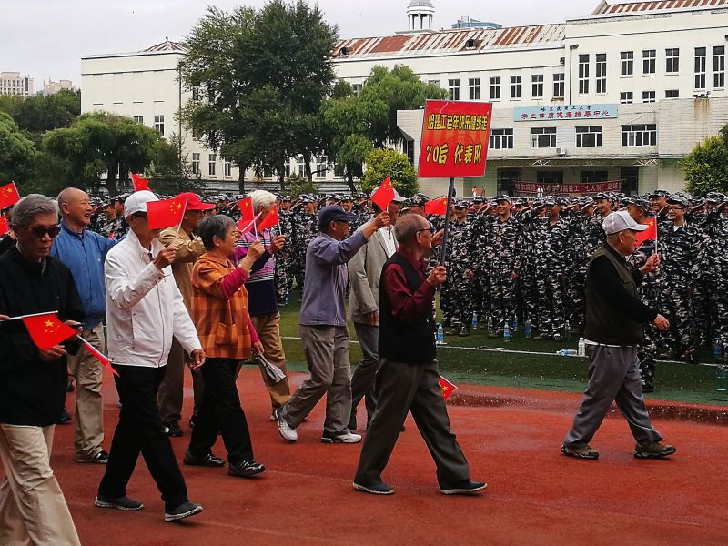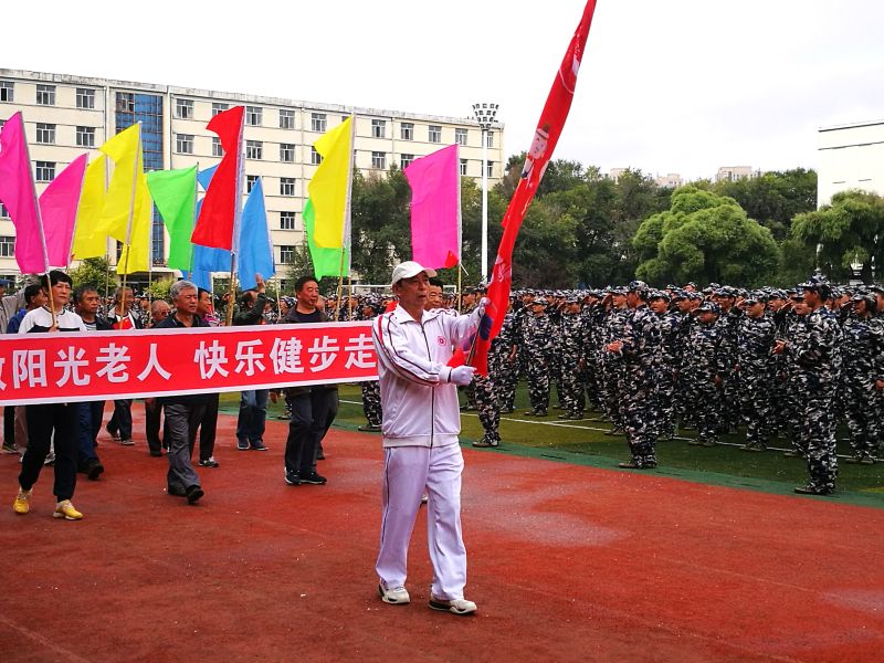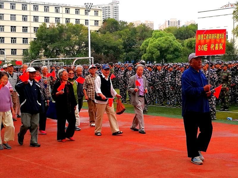 在健步走起步前,为不影响新生军训,离退休工作处领导与后备军官学院刘丽娟副院长进行了沟通,得到军训总教官的大力支持和积极响应,他们立刻从其他操场调来两个一百人的方队,200名学生在操场内圈每两米一人围成一圈,面向老同志,鼓掌助威。当我们老同志健步走的队伍路过学生方队时,老同志们关切地向学生问候:同学们,辛苦了!学生们立即答到:祝老师节日快乐!并以军礼回敬。