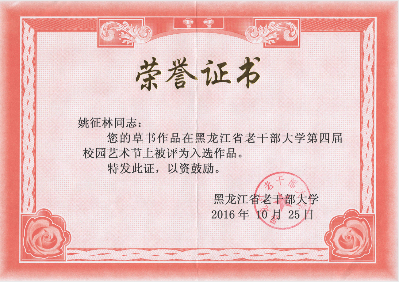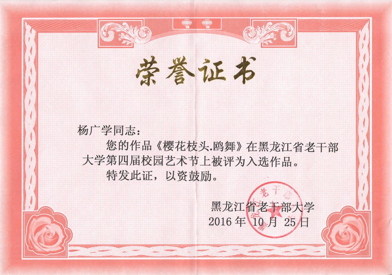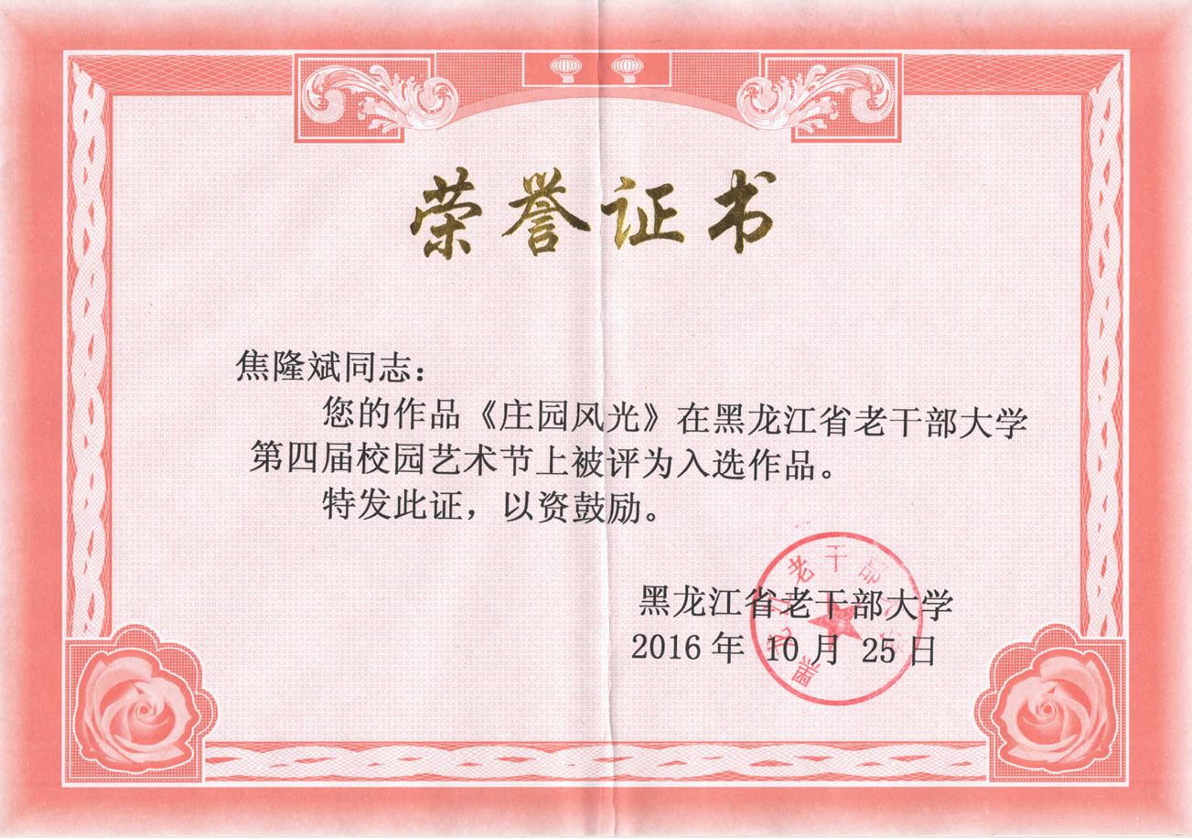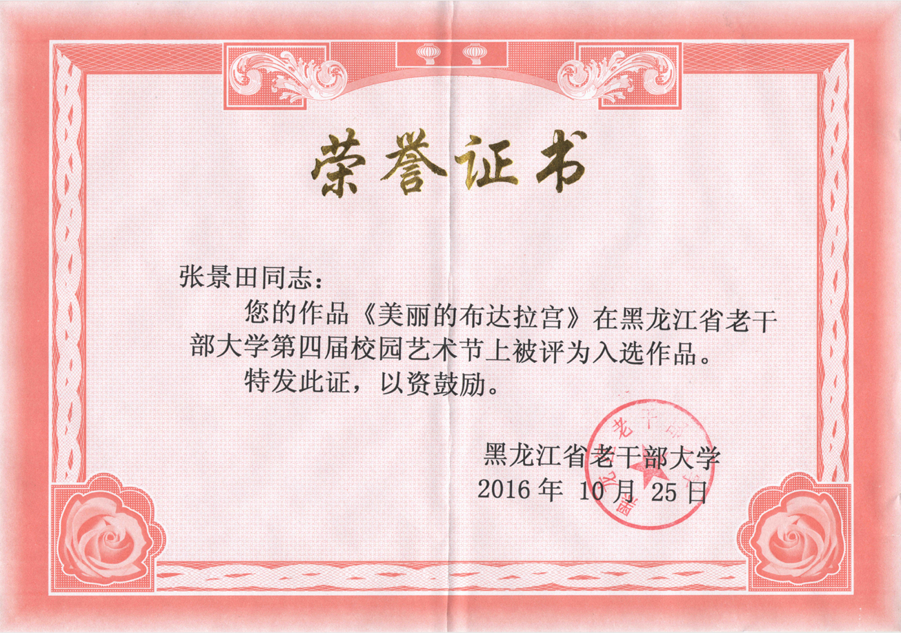 为了组织好本次参展活动,我校老年学院按照组委会要求,共报送学员书法、绘画、摄影作品15件。姚征林同志的草书作品、张景田同志的摄影作品《美丽的布达拉宫》、焦隆斌同志的摄影作品《庄园风光》、杨广学同志的摄影作品《樱花枝头.鸥舞》在黑龙江省老干部大学第四届校园艺术节上被评为入选作品。