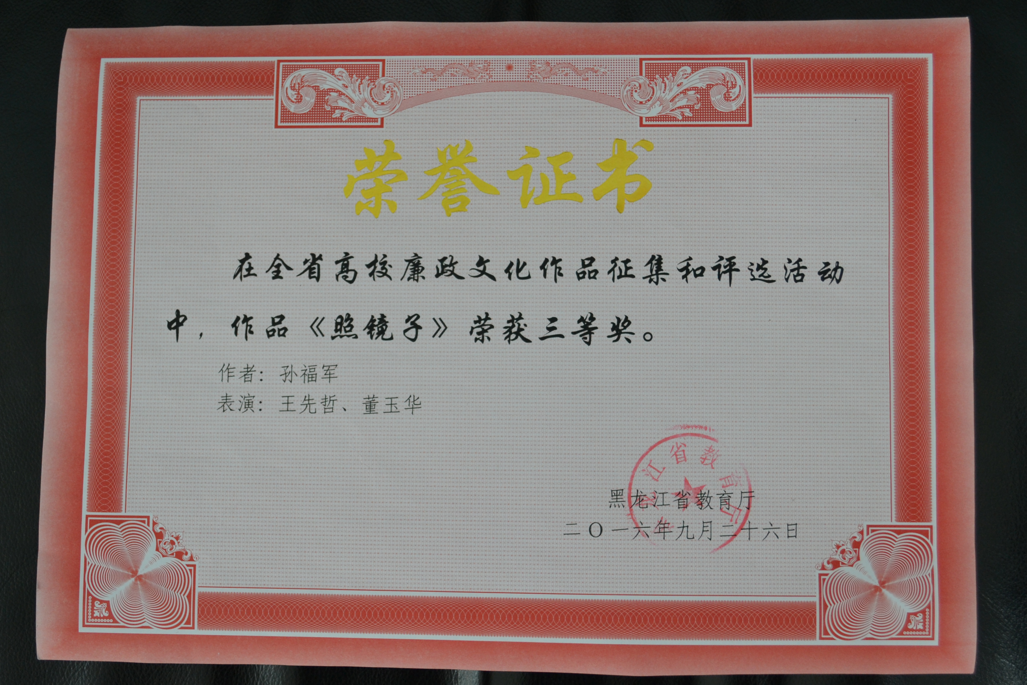 日前,省教育厅举办的2016年全省高校廉政文化作品征集活动落下帷幕,由我校退休教师孙福军创作,王先哲、董玉华共同演绎的诗朗诵《照镜子》荣获三等奖。这是我处立足实践,积极推进彰显理工特色的廉政文化建设所取得的又一硕果。