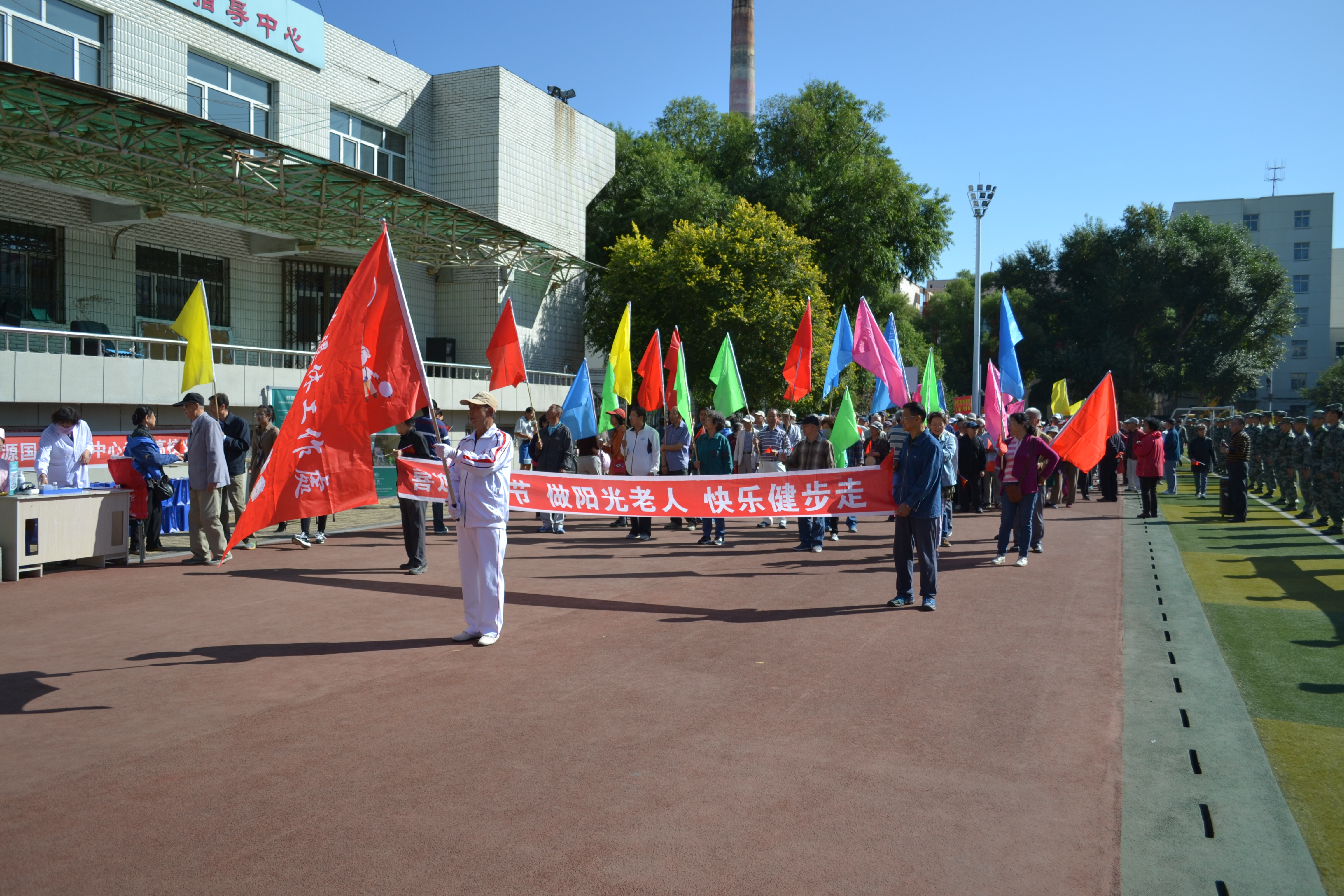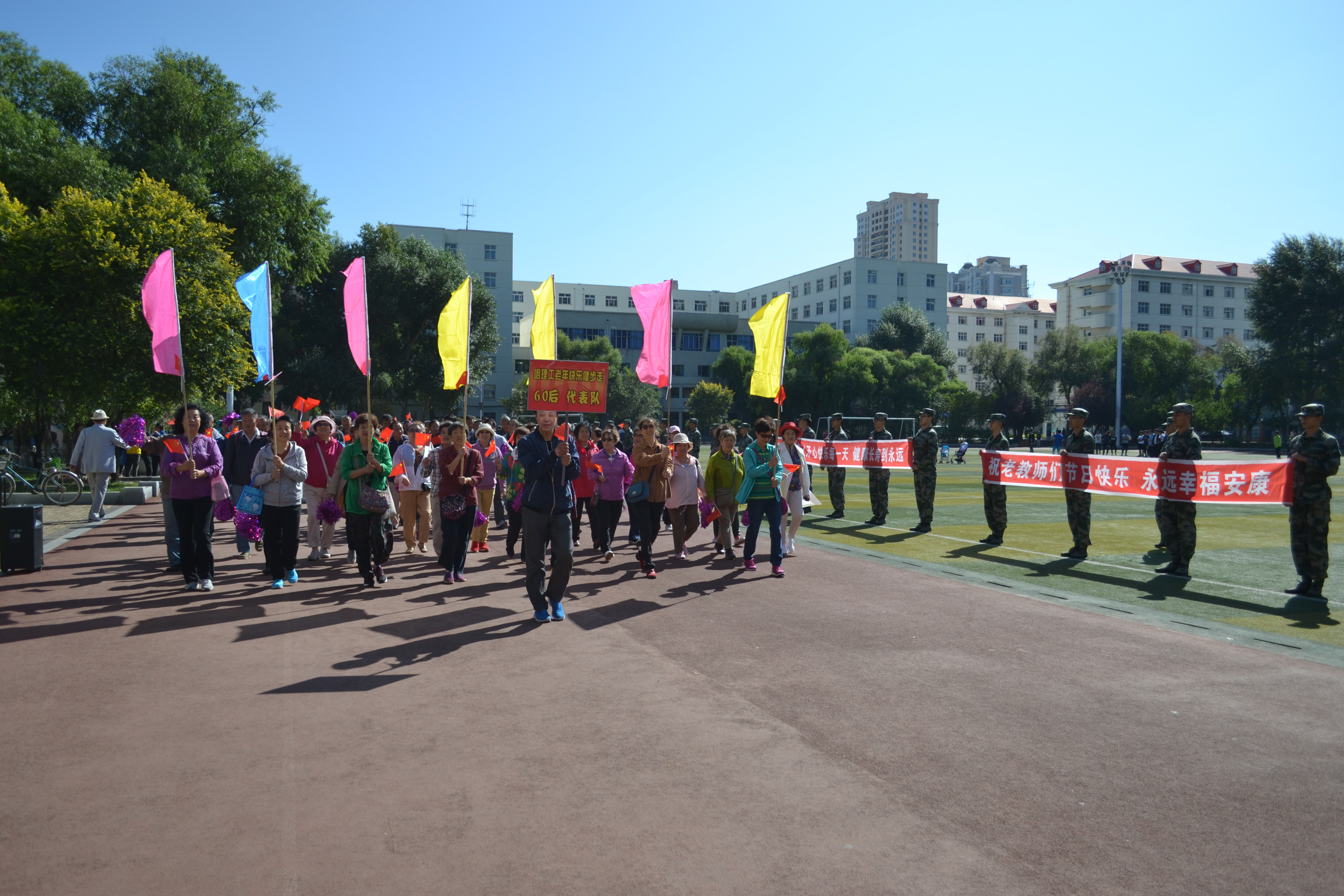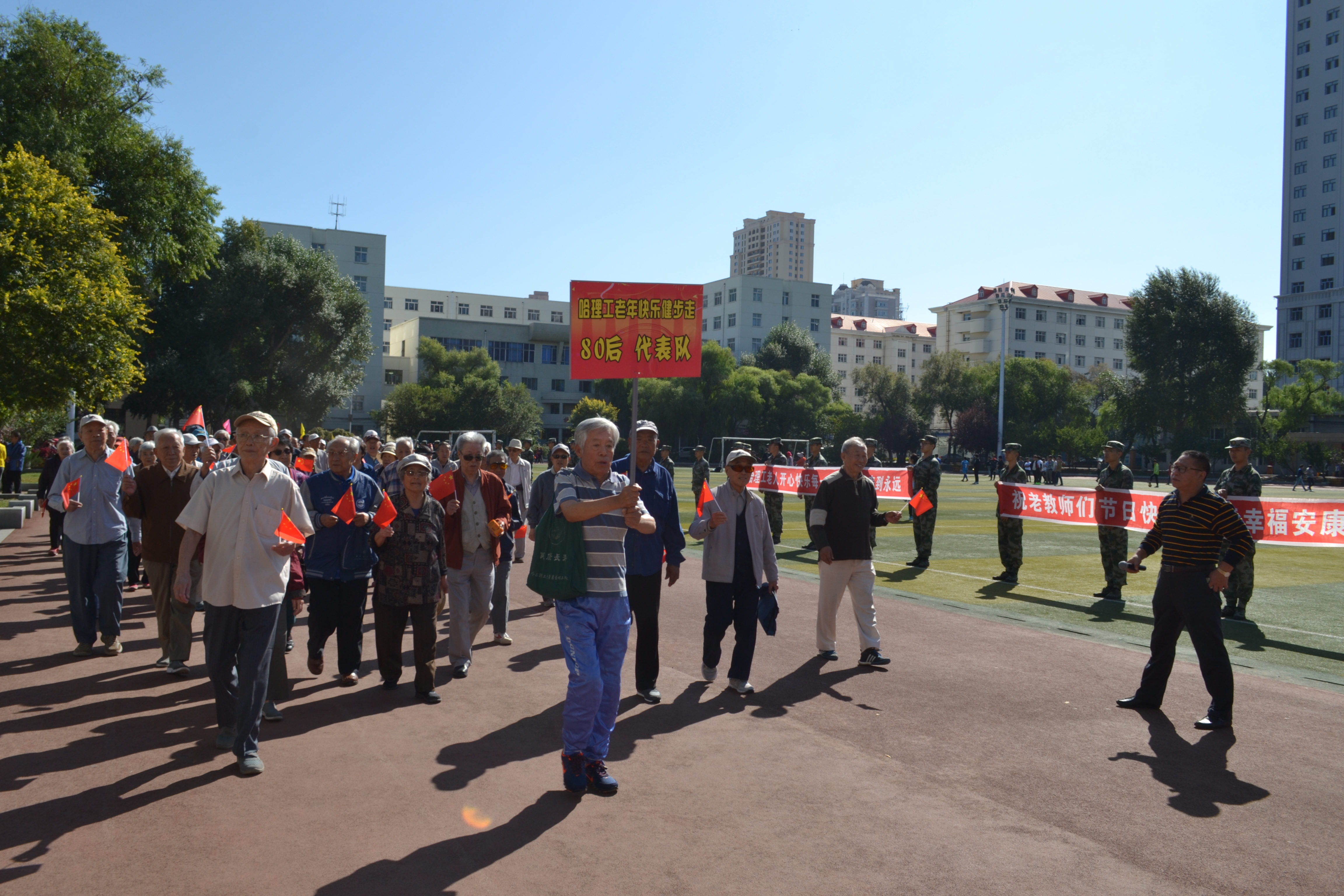 教师节**健步走是我校离退休工作处的特色活动之一,以年龄段划分组别,80岁以上的老人们打着“80后代表队”的牌子,绕操场走一圈,70后走二圈,50、60后走三圈,老人们在健步走的过