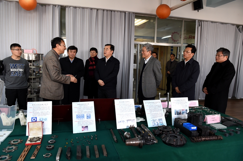 张庆伟首先来到国家大学科技园,听取了我校国家大学科技园的基本情况、取得的主要成绩以及科技园所开展的科技企业孵化、科技成果转化、公共技术服务、创新创业人才培养和创客空间等特色服务的介绍。在科技园科技成果展示区,张庆伟书记了解了我校部分教师及园区企业研发的高效切削刀具系列产品、3D打印SIC陶瓷产品、微弧氧化牙种植体、建筑用纸面草板、禽类养殖照明控制系统、智能化流量分类和安全监控系统等科研成果的功能、特点、市场推广情况等,听取了我校教师对相关科研成果转化的情况介绍。